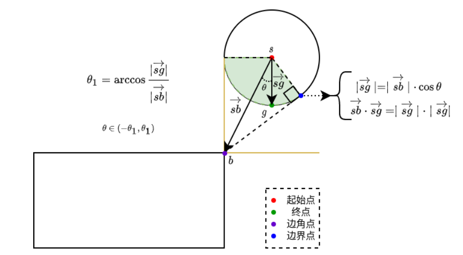 当 \overrightarrow{s b} \cdot \overrightarrow{s g}<=0 时,即下图浅绿色表示的区域,此时,线段与矩形盒的距离表示为 |\overrightarrow{s b}|