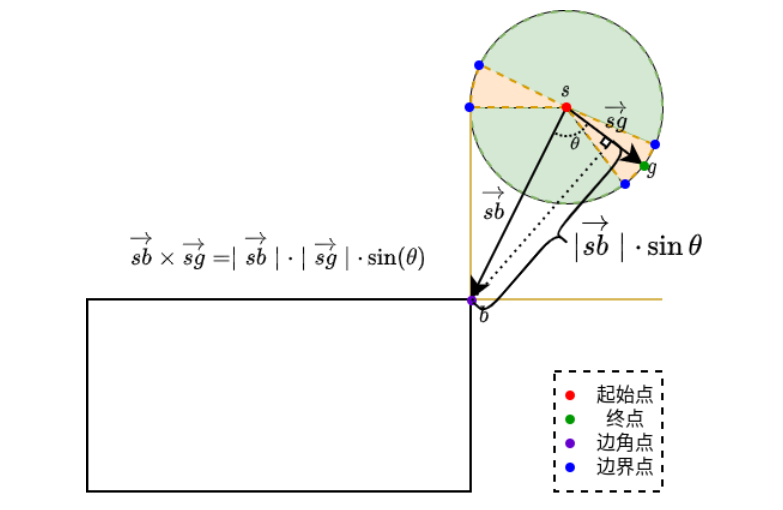 当上述条件都不满足时,即位于下图浅黄色区域,线段与矩形盒的距离可以表示为 |\overrightarrow{s b}| \sin \theta可使用向量叉乘得到 \frac{\overrightarrow{s b} \times \overrightarrow{s g}}{|\overrightarrow{s g}|}