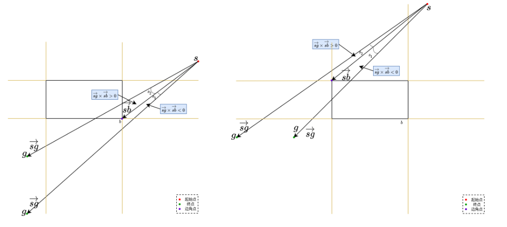 当终点位于区域 6 时,先判定线段与矩形盒是否交叠,如下图所示,通过计算向量叉乘 \overrightarrow{s g} \times \overrightarrow{s b} , 判断线段是否与矩形盒交叠
