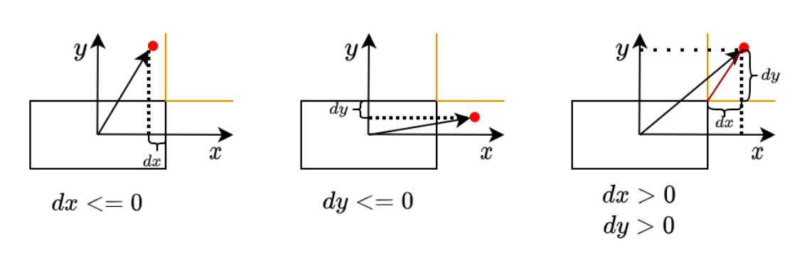 如下图所示,点到矩形盒的距离可以分为如下三种情况: