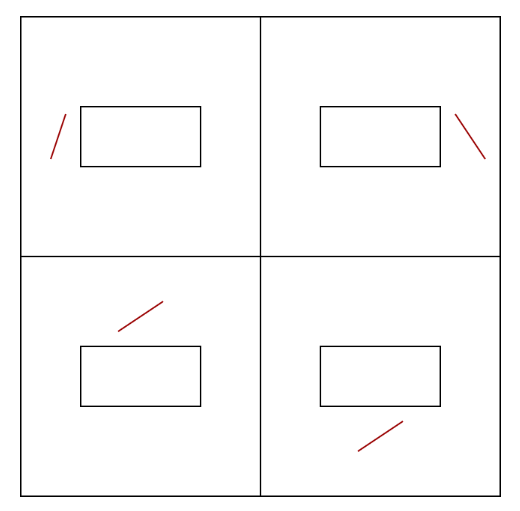 关于某线段与矩形盒关系的判定,先计算线段的长度,如果线段的长度为 0, 则可以把该线段当作一个点,利用点和矩形盒的距离来判断是否交叠;如果线段的长度不为 0, 则先进行线段与矩形盒的粗判定,即线段的起始点与终点是否落在矩形盒的一边,如下图所示,表示线段位于矩形盒一边的四种情况。如果线段不满足如下关系,则交叠关系可以通过距离来判断.