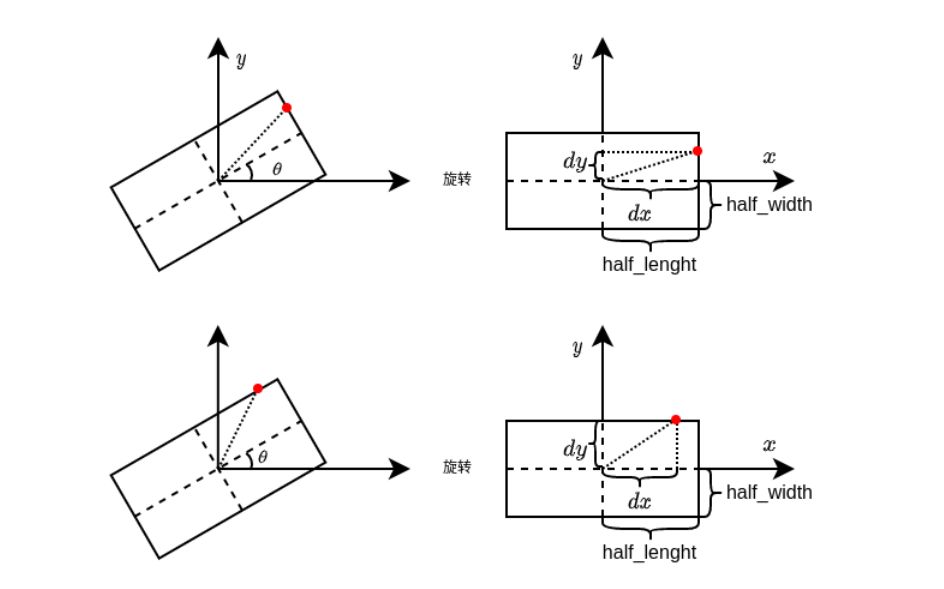 如下图所示,红色圆点与矩形盒的关系如下图左侧,为了便于判定红点是否在矩形盒内,将下图左侧整体按照航向角顺时针旋转 \theta 角度,得到下图右侧状态。此时,只需要判定红点的坐标 (d x, d y) 是否满足 |d x|<=\text { length }_{half} 或者 /|d y|<=\text { width }_{helf} ,则说明红点位于矩形盒内.