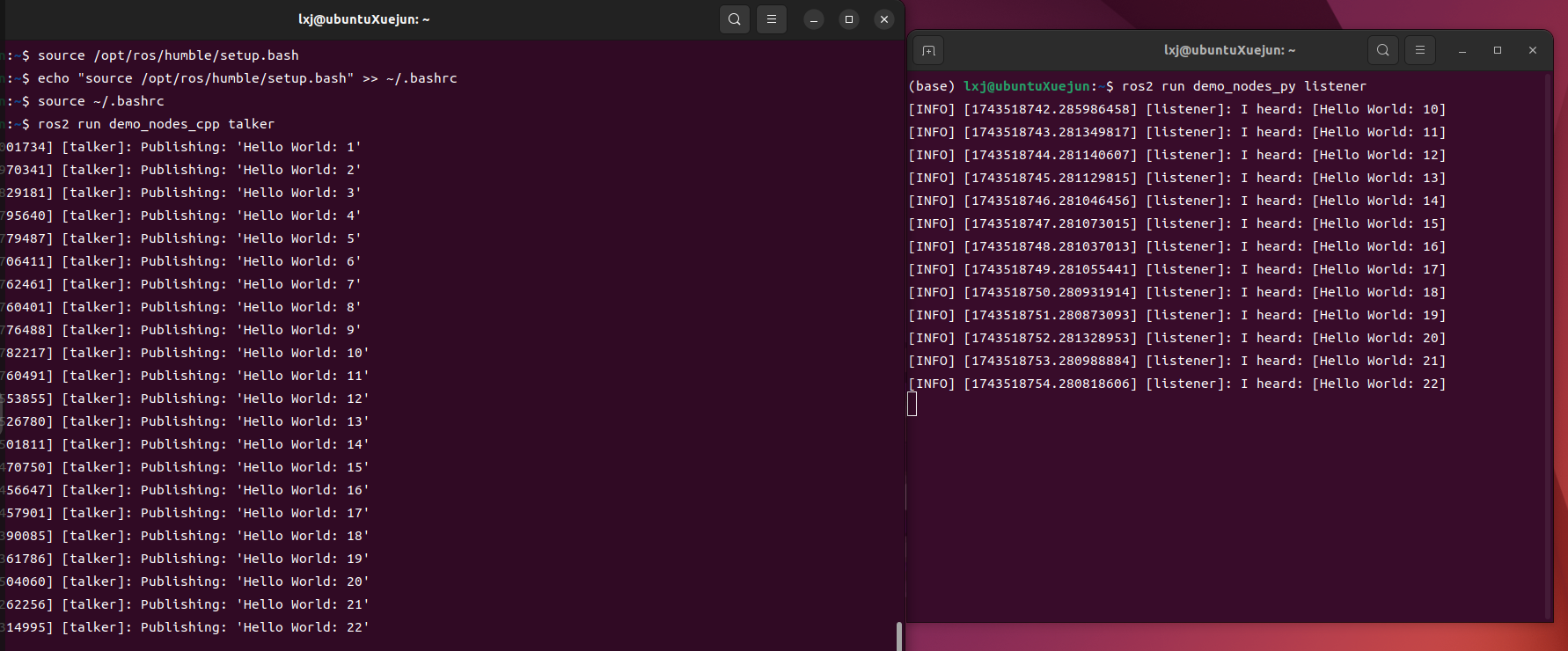 如果可以看到消息传递,说明 ROS 2 已正常运行。