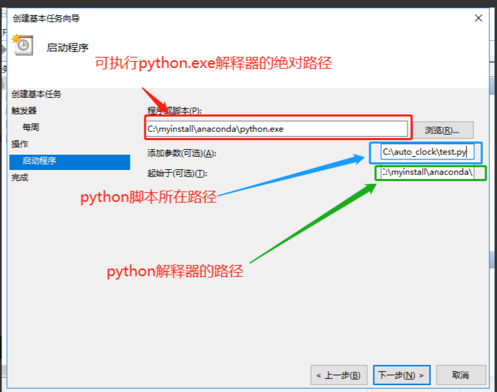 如果将这三部分连在一起,就是“C:\myinstall\anaconda\python.exe C:\auto_clock\test.py”,这其实就是在Windows命令行下输入“python C:\auto_clock\test.py”(或“python test.py”,如果你正好在C:\auto_clock目录下),只是在计划任务的设置中需要给出完整的python编译器的路径而已。